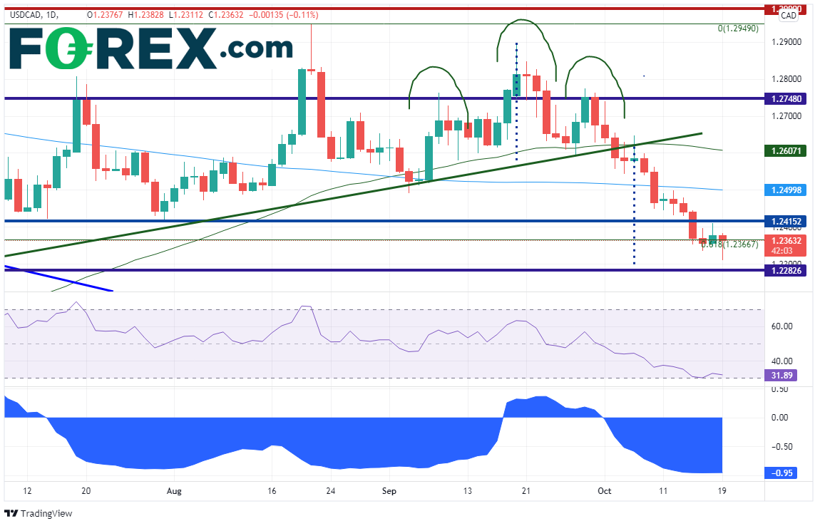 加拿大核心CPI剔除了能源与食品价格,然而加元紧紧跟随的是西得州原油的脚步。所以,更合适的做法可能是观察加拿大的表面CPI而不是其核心CPI。美元/加元和西得州原油期货之间的相关系数为-0.95,表明两者之间几乎是完美的负相关联系。美元/加元在过去14天里只有三天收高,于6月1日低点到8月20日高点行情的61.8%,即1.2366附近企稳。该货币对周二先是跌至1.2311形成新的趋势低点,之后反弹并形成锤子K线形态。美元/加元或已“足够接近”头肩顶形态的目标价格,即1.2300。如果表面CPI读数弱于预期,该货币对或上攻1.2415阻力位。200天均线交叉于上方的1.2500附近。支撑位在周二低点1.2311,接着是6月23日低点1.2254附近。