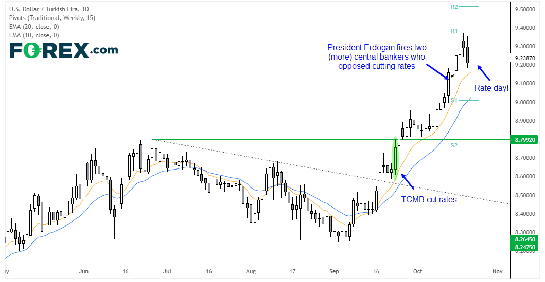 土耳其将于英国夏令时12:00宣布隔夜借贷利率决定。很多人对此心存担忧,尤其埃尔多安总统上周刚刚解雇了三位反对降息的央行官员(为应对约20%的通胀率,目前利率16.5%)。上个月,土耳其央行将利率下调100个基点,美元/土耳其里拉因此在连续两天回落后,当天上涨1.34%。我们还发现,货币对在今天会议召开前两天同样展开回调。
