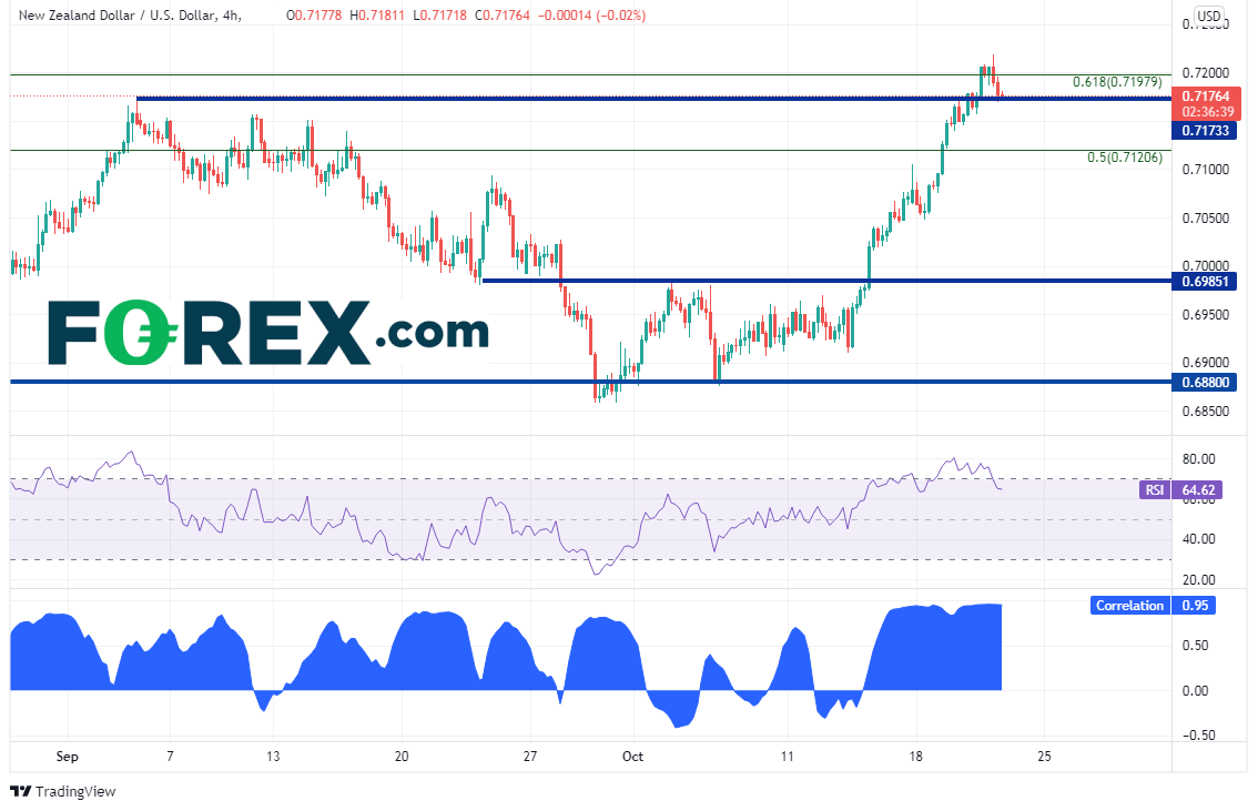 两者在4小时图上的相关性高达+0.95,几乎可以说是完美的正相关关系。所以,如果纽元/美元在这个较短的时间周期内很快回撤,标普500指数很可能也随之回撤。