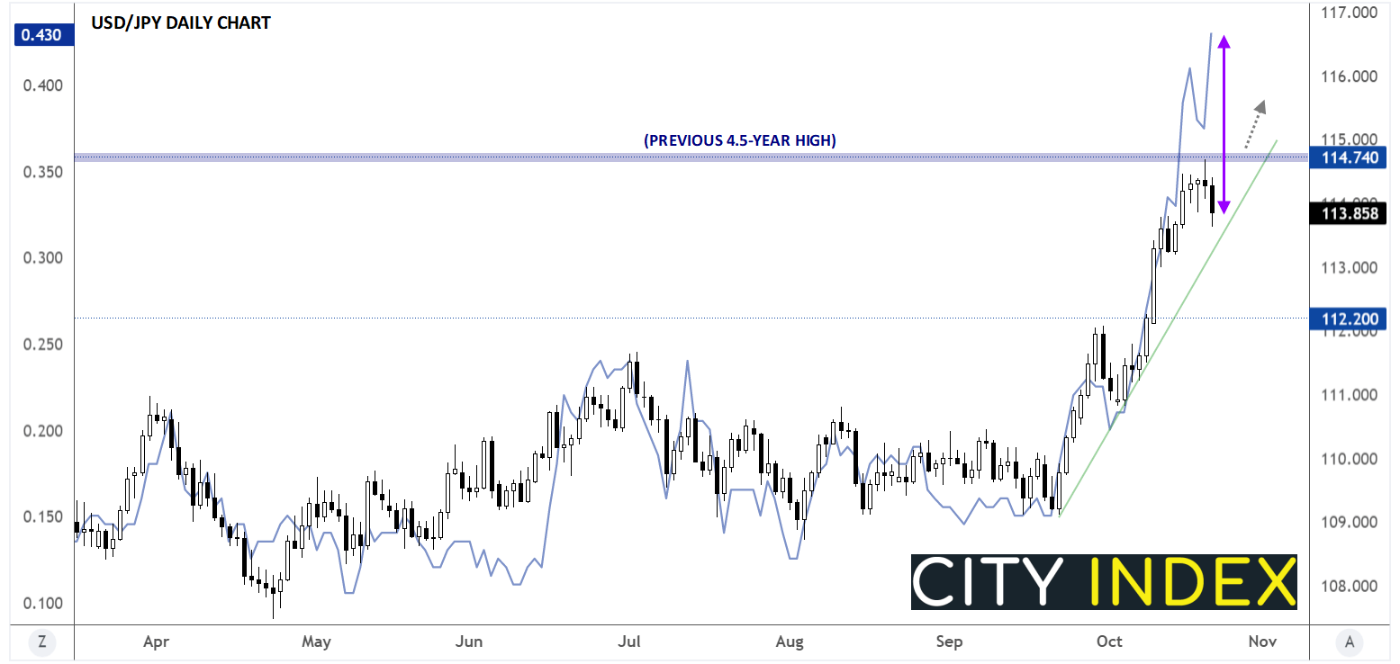 事实上,美元/日元周三测试了逾四年半最高点114.70附近,不到一个月就斩获超过550点子涨幅。114.70是备受瞩目的阻力位,多头在经历如此大幅度的反弹之后于该区域获利回吐也合情合理。但我们(至少)有四个理由,相信美元/日元可以继续反弹,攻克阻力位后创下新高: