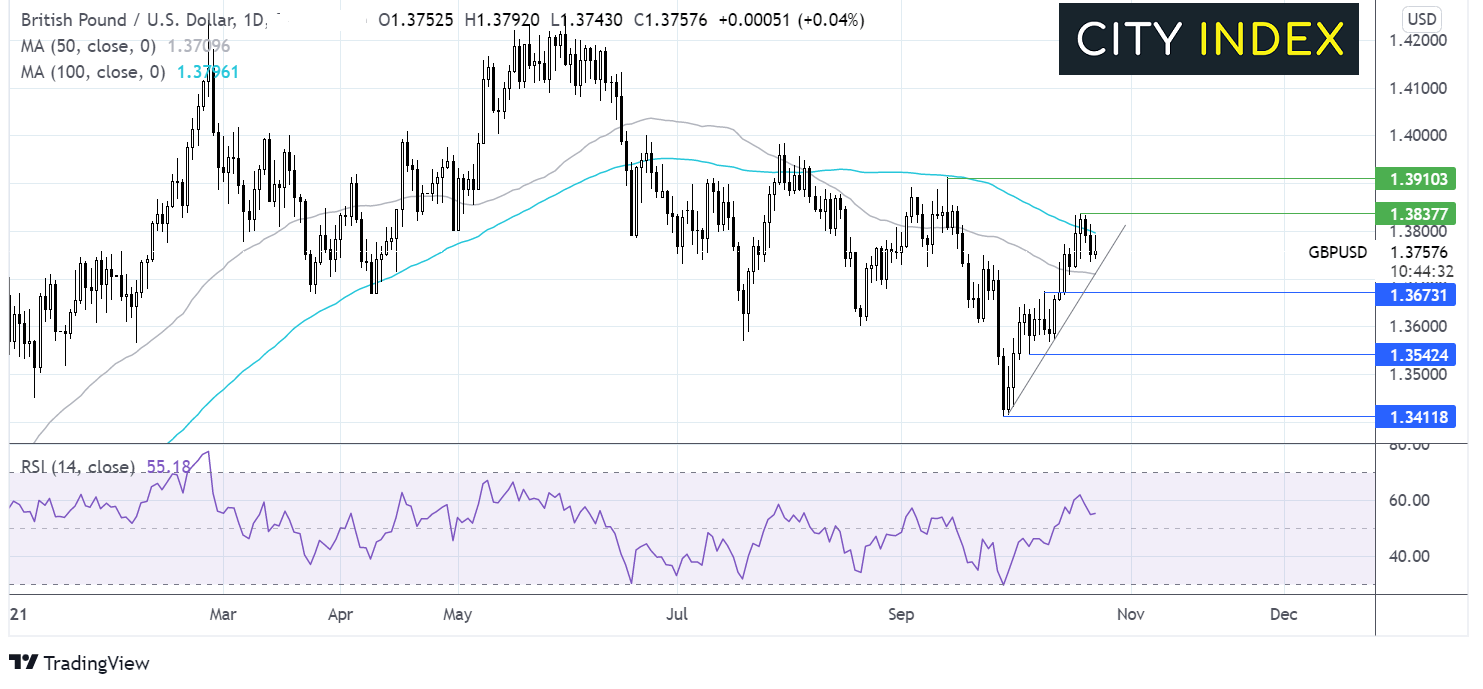 买家可能会寻求汇价上穿50 均线,以重新测试上周高点1.3835,看向9月高点1.39。