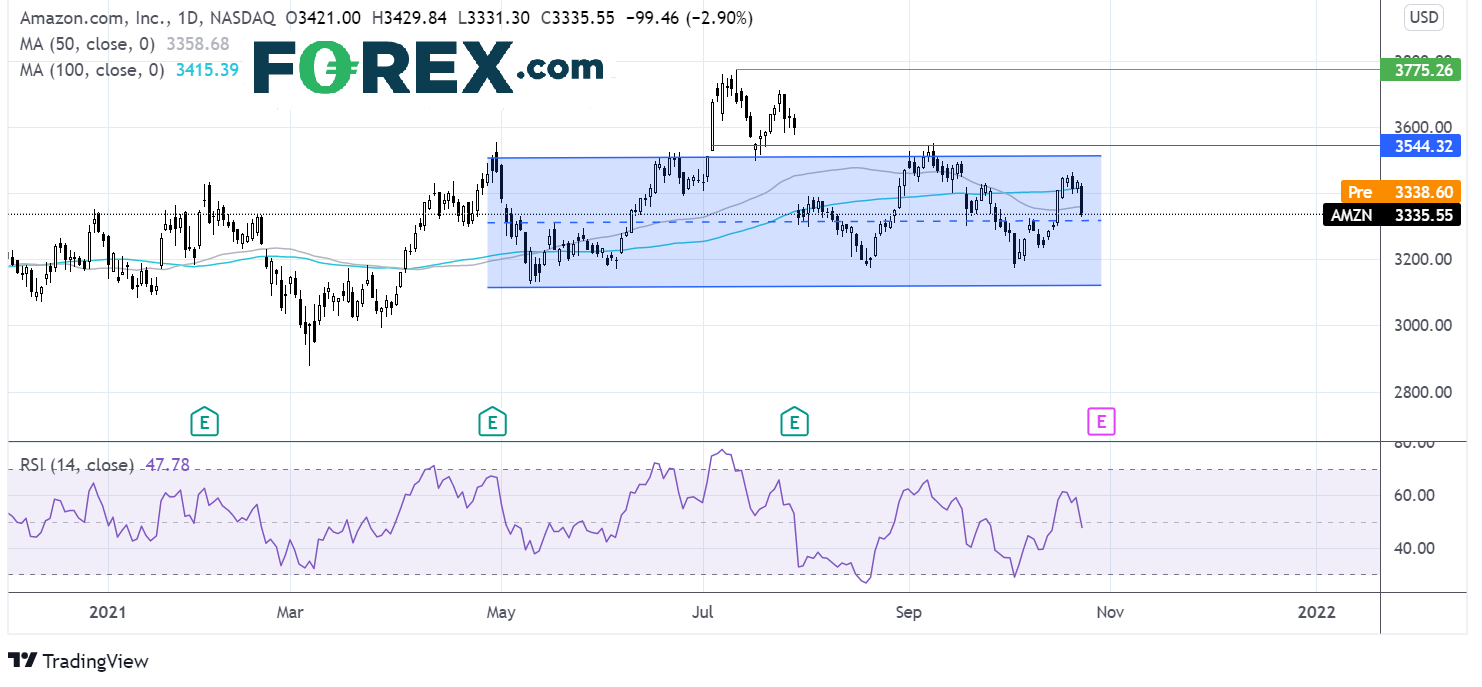 亚马逊股价目前交投于上述区间的中轨。均线走平,RSI处于中性区域。