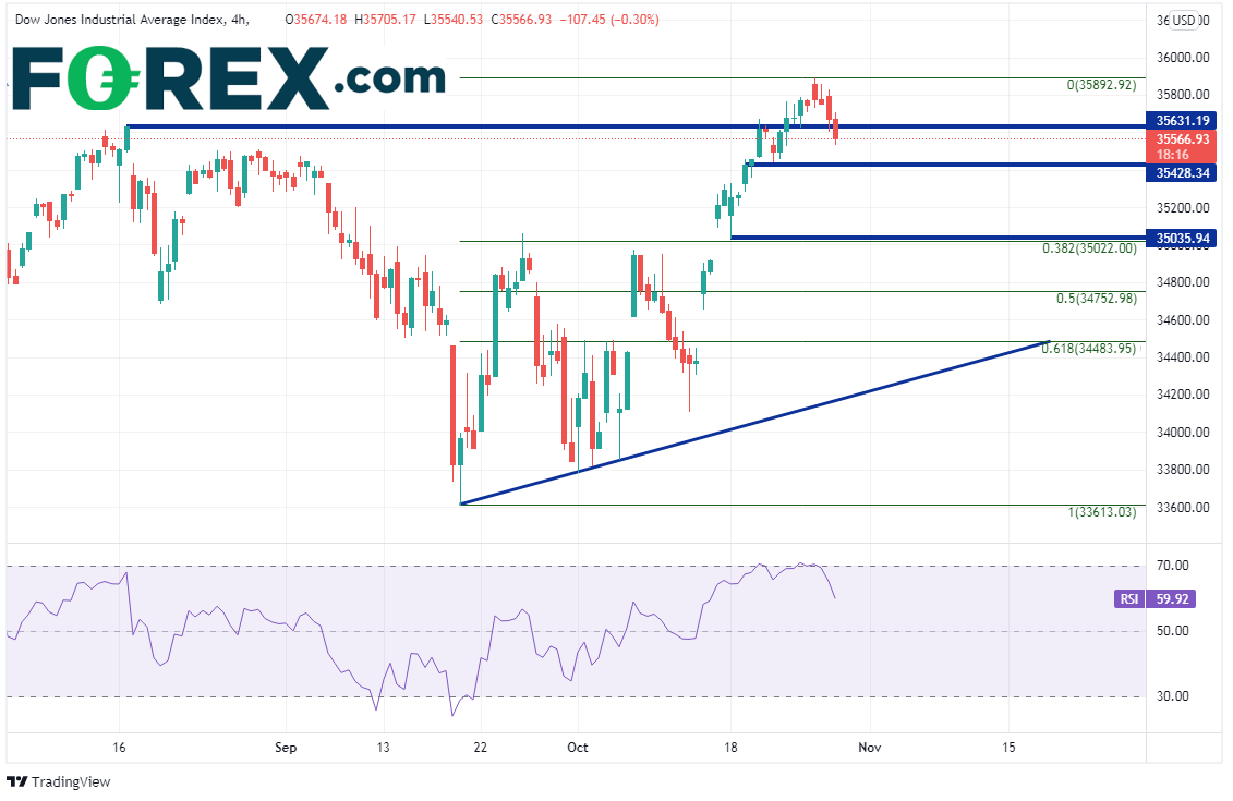 4小时图上在35428附近有一些盘中水平支撑位,35035.94附近也有水平支撑位,那恰好也是9月20日低点到10月27日高点行情的38.2%回档位所在。该位之下有跳空开盘缺口34934、50天均线34913。上档阻力在10月27日高点35892.92、5月10日以来上斜趋势线36000附近(请看日图),接着是8月16日高点到9月20日低点的127.2%扩展位36172.78附近(请看日图)。
