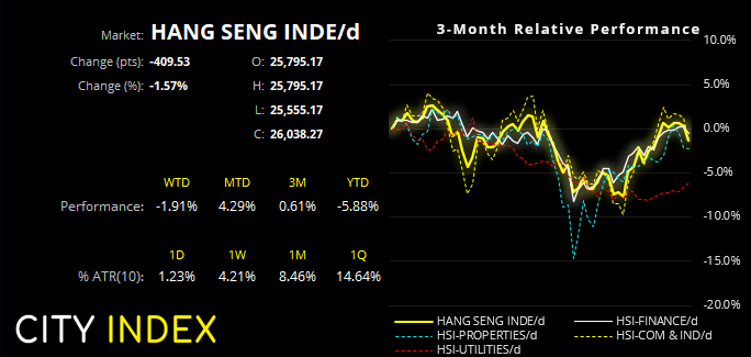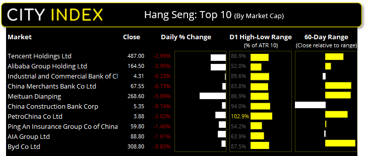 恒生指数收盘下跌1.6%,创三周以来最大跌幅。市值前10的股票悉数走低,腾讯(0700)和阿里巴巴(9988)拖累股指下挫,本周分别下跌4.4%和5.7%。这意味着,恒指在自10月低点反弹10%之后,显然处于反向跌势之中。