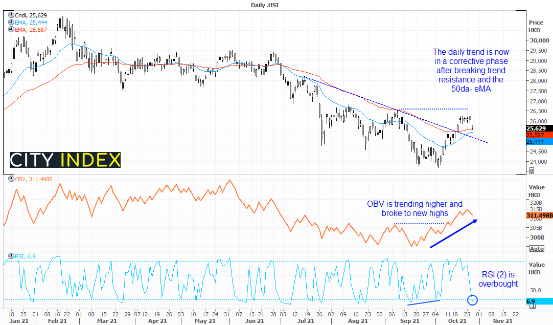 恒生指数日线图仍然看涨,但正处于修正阶段