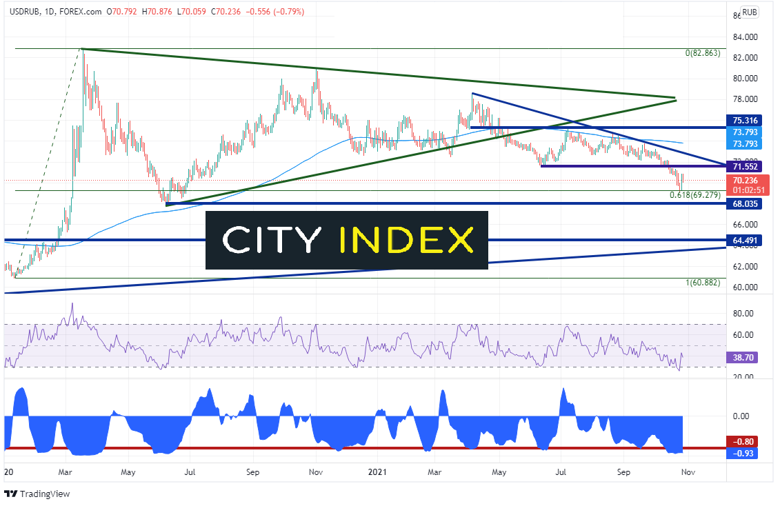 美元/俄罗斯卢布持续走低,但货币对自2020年1月低点至2020年3月高点上行之61.8%斐波那契回档强劲支撑反弹。