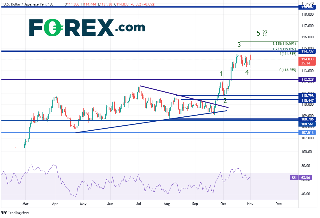 美元/日元和美国债券收益率通常同向波动,如果收益率(特别是10年期国债的收益率)将要上涨,美元/日元或同步走高。美元/日元日图在9月23日,即上次FOMC会议之后不久上破对称三角形,走出形似艾略特波浪理论的五浪推动浪行情。下一浪上涨的目标可能在115.09和115.59,但首先必须攻克114.73的前高点。下个水平阻力位在遥远的118.66。第一个支撑位在浪4低点113.25,然后是水平支撑位112.23。