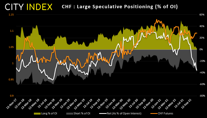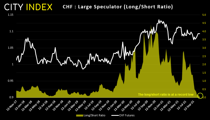 交易员对瑞郎处于2019年12月以来最为看跌状态。净敞口指标过去11周中有10周下跌,而总多头仓位接近纪录低点。但期货价格却升至11周以来高点。在某个时刻,我们可能会看到空头回补以推高价格,或者相反,汇价要转跌来确认当前看跌率的合理性。
