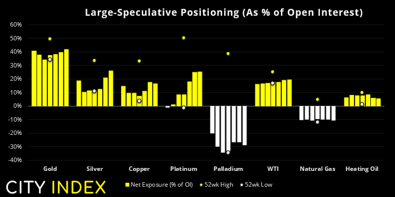 - 交易员连续第四周增加对黄金期货的净多头敞口,目前情绪最为看涨。
