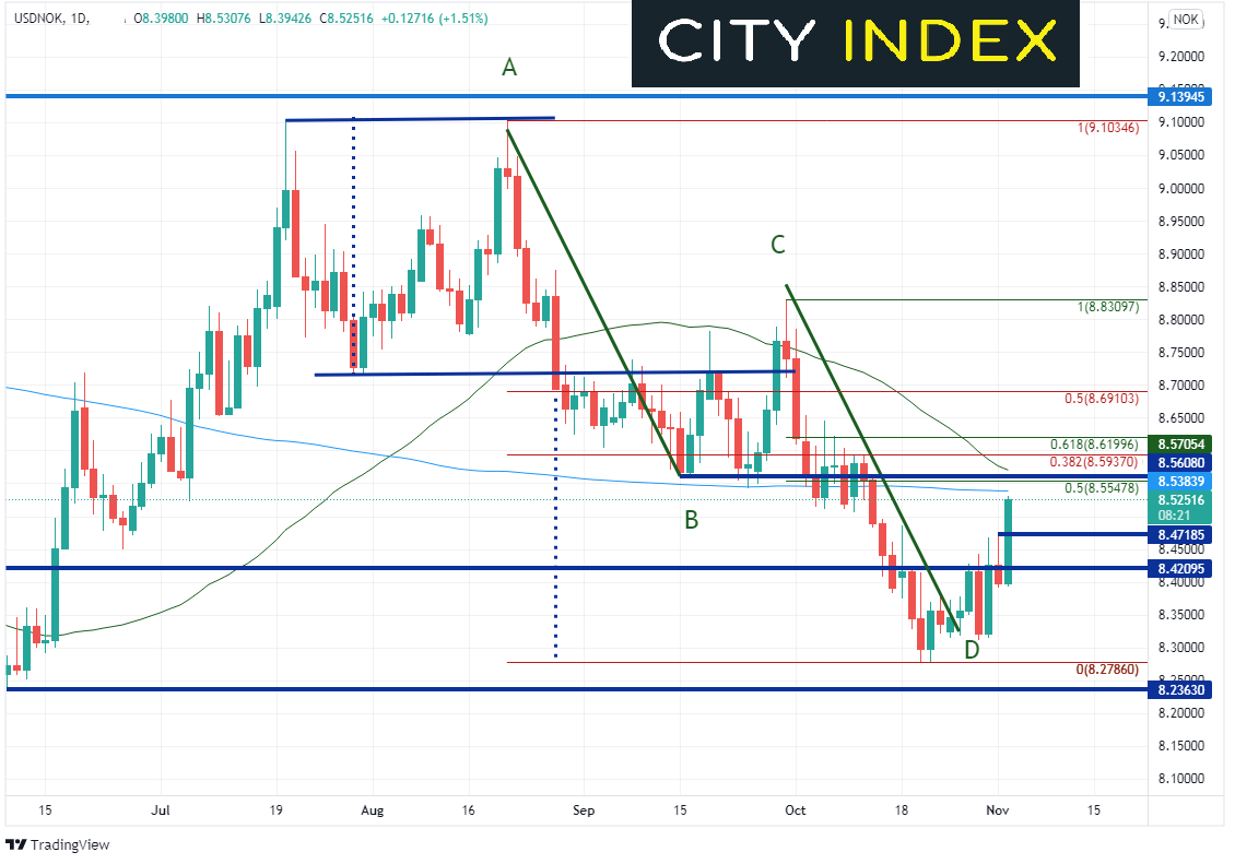 - 技术面:日线图上,美元/挪威克朗近期到达8.2800附近双顶形态和AB=CD形态目标。货币对10月21日在8.2786触底反弹。包括今天1.5%涨幅,汇价此后已升至8.5308。货币对还构筑看涨吞没K线形态。美元/挪威克朗涨势于200天均线8.5384下方暂停。该关键均线上方8.5548和8.5705之间有一个阻力汇聚区,其中包括9月30日高点至10月20日低点下行之50%回档,水平阻力以及50天均线。如果阻力保持,日内支撑位落在周一高点8.4718,今日低点在8.3943