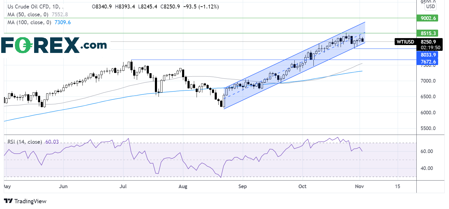 西得州油价继续交投于8月中旬以来的上升通道内,撞上7年高点85.10后遇阻小幅回落,RSI也自超买区域回撤。改变看涨趋势的前提可能是下破10月28日低点80.30,而多头的目标可能在85.26上方的多年新高。