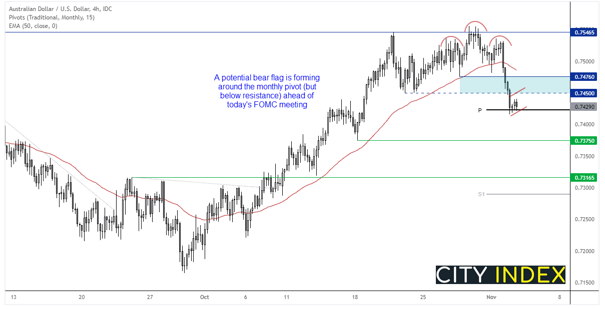 基于对FOMC鹰派预期,在澳洲联储昨天鸽派基调之下,我们认为澳元/美元做空的机会或更大。看跌动能自头肩形态右肩加速。汇价当天收于0.7450支撑位下方,我们希望此处作为阻力位封顶。一个潜在熊旗信号正在低位形成,但月图枢纽提供支撑。因此,我们现希望美联储态度强硬,从而为澳元下破0.7400提供必要催化剂。