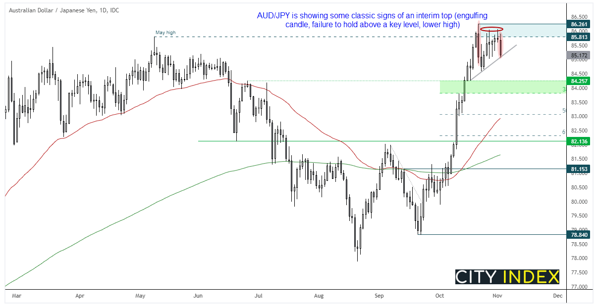 澳元/日元下跌约0.6%,看来正在构筑临时顶部。考虑到汇价持续攻入5月高点却无法突破,我们正在密切关注该关口,此处显示典型拐点迹象。10月21日的看跌吞没K线带动汇价今天下穿5月高点,若干条十字线试探关键水平后推低。若日收盘在当前水平附近,则确认三K反转。若失守趋势支撑,聚焦84.58低点,下个可行的反趋势目标在略下方的84.0位置。