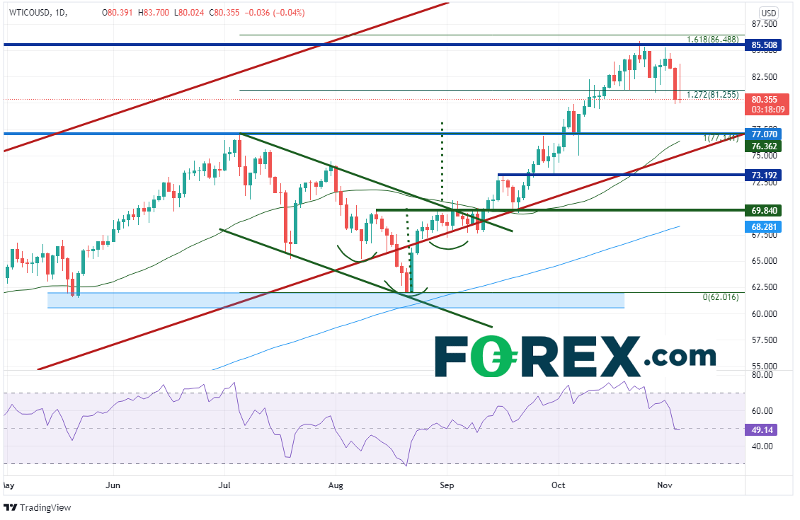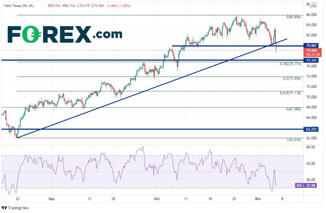 西得州油价当天在OPEC+决议公布之前上涨,原因在于市场意识到OPEC不会增产。但油价在上述宣告之后自83.70高点调头向下,跌至78.52低点,跌幅接近6.2%。有关美国可能向市场释出战略储备石油的传言令人兴奋不已。(拜登不也说过将出售部分战略储备石油用于基建吗?)油价在收盘前反弹,当天跌幅收窄至1.75%。油价4小时图下破8月22日以来的上斜趋势线兼水平支撑位所在的79.88,下个支撑位在遥远的7月以来前高点77.14,接着是8月22日低点到10月25日高点行情的38.2%回档位,即76.77附近,然后是50天均线所在的76.36(请看日图)。阻力位现落于前支撑位79.88、周四高点83.70。