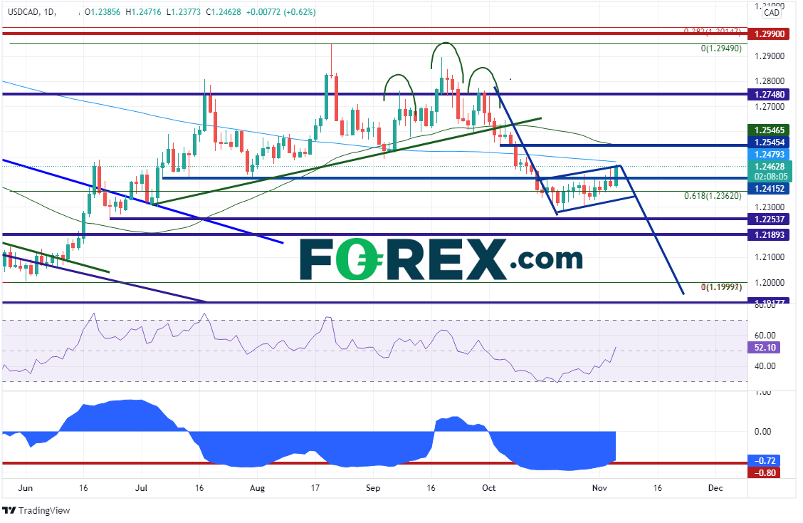 在OPEC按兵不动的情况下交易者可能认为油价应当上涨,但油价却因美国或许释出战略储备石油的传言而暴跌。鉴于周四收于10月8日以来最低点79附近,政府或许趋于保守。如果油价确实走高,请留意美元/加元自旗形上轨阻力兼200天均线下跌。