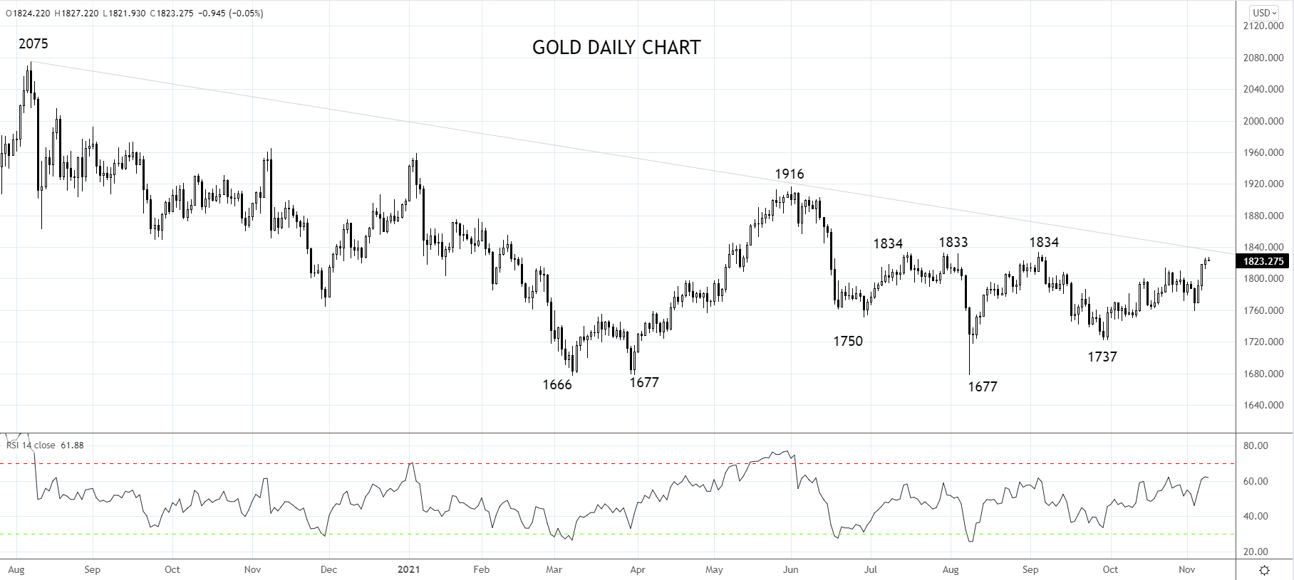 如果本周美国CPI数据未逆转实际收益率走势,金价将面临1835/40美元关键阻力位,此处曾作为7月-9月间的三个高点及2020年8月2075美元高点以来下行阻力位。