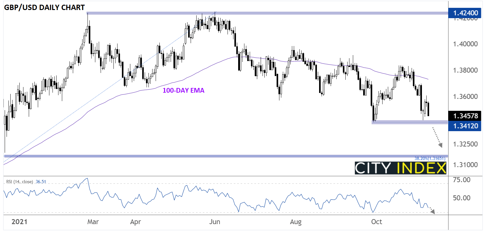 接下来看图表。英镑/美元过去几个月的高点不断下降并且10月份的逆势反弹缓解了超卖状态,展望后市,如果确定下破至1.3412下方的年内新低,则可能打开持续下跌的空间,下档的重要支撑位在较遥远的1.3200下方,那是2020年-2021年反弹行情的38.2%回档位。只要反弹未能守住其100天指数移动均线(目前落在1.3730附近),阻力最小的方向可能仍然是向下。