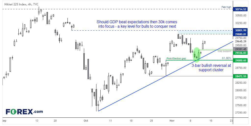 日经225指数周四设法打破了四连跌势头,日图上就在29000上方不远处形成看涨吞噬K线。这波修正行情更值得注意的部分可能是其几乎(但并未完全)填补大选后形成的跳空缺口。29000恰巧也是61.8%回档位和10月低点以来的上涨趋势线。
