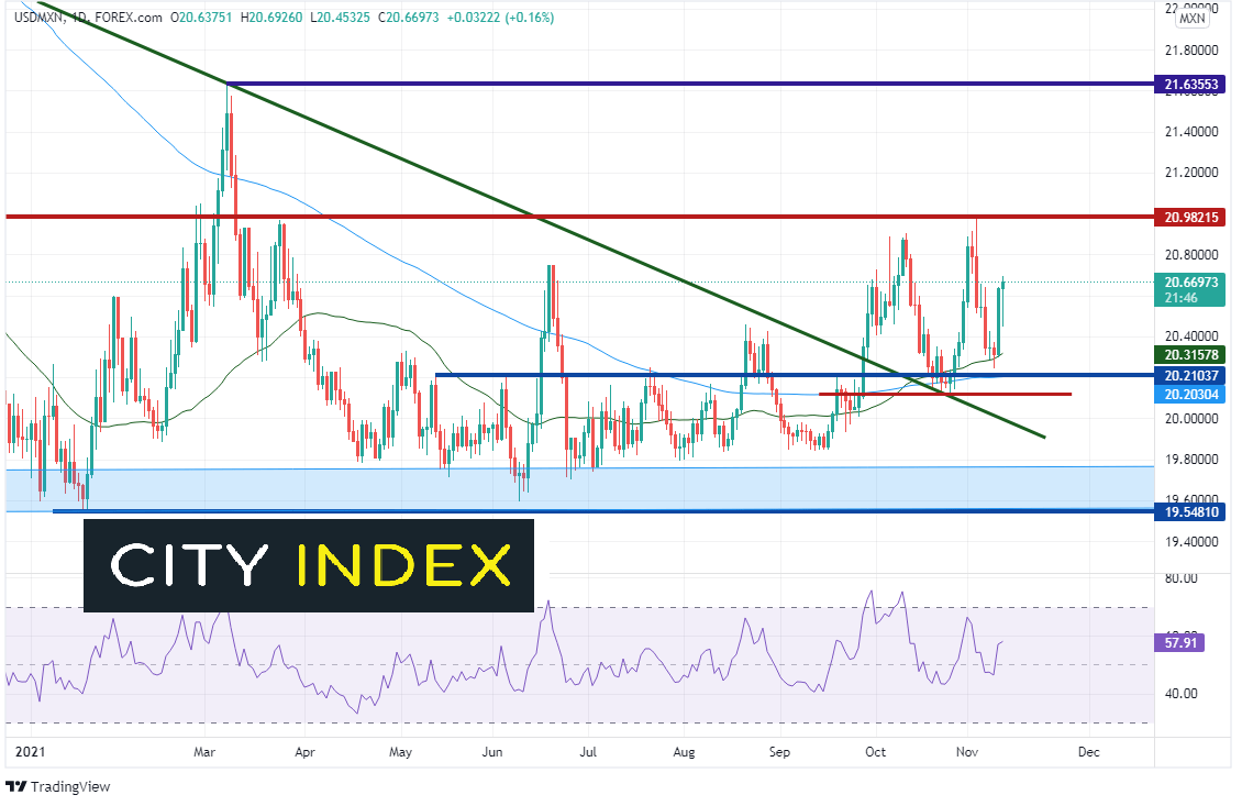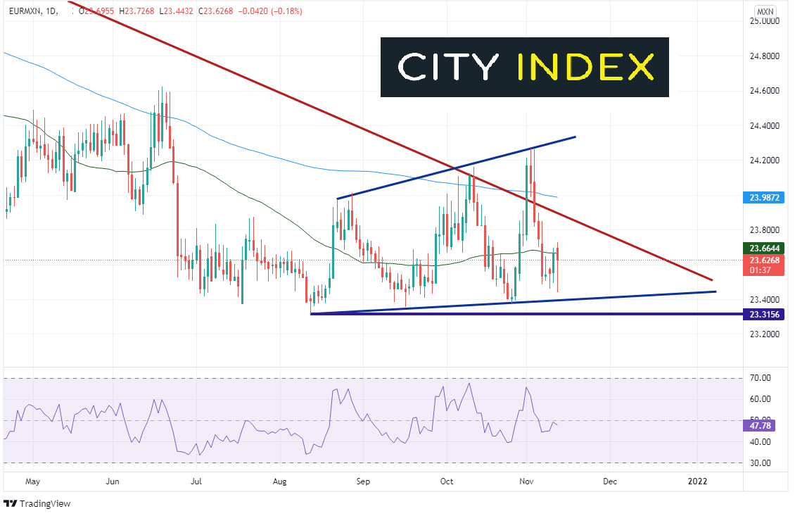 并非只有美元/墨西哥比索遭遇抛售并在当天结束时行情逆转。欧元/墨西哥比索同样于声明发布前推低,之后引来买盘,收盘仅微跌0.11%,接近持平。货币对徘徊在50天均线23.6646附近。上方阻力位2020年4月23.8830附近长期下斜趋势线(红色),20天均线23.9872,然后是11月3日高点24.2628。下方强劲支撑位在23.40和23.30附近趋势线。