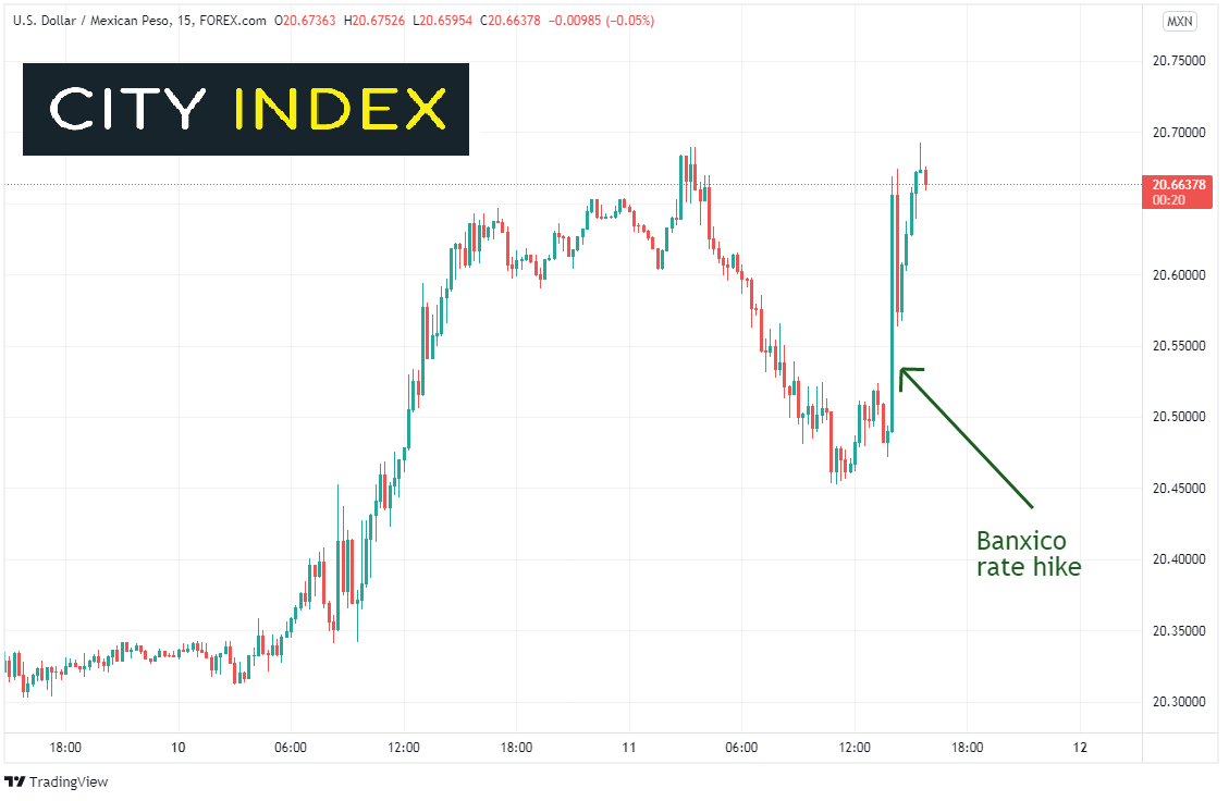 显然,一些交易员曾预计央行将加息50个基点,因此,在25个基点加息声明发布后,美元/墨西哥比索大幅冲高。汇价瞬间自20.4895上涨到20.6691,收复当天全部失地。