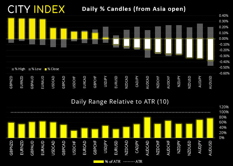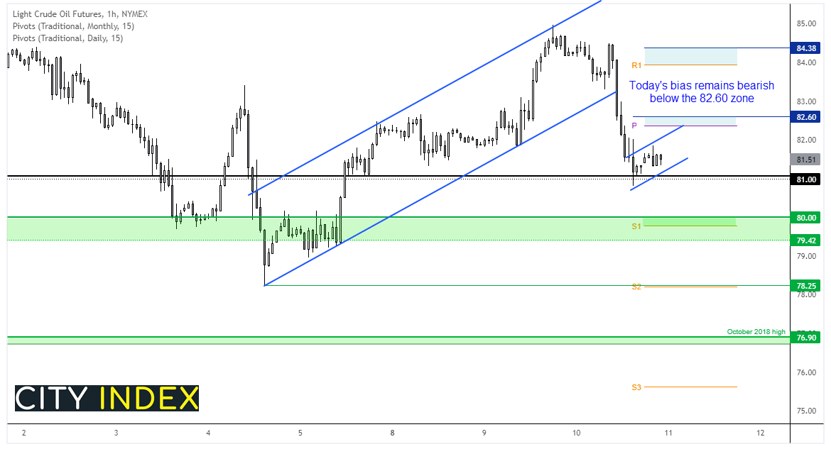 我们今天保持看跌偏见,并倾向油价将在82.37- 82.60区域下方盘中反弹。值得注意的是,月图枢纽在81美元附近,因此,从风险回报角度来看,空头可能会在进入高点时入场推低或等待价格探入新低。由于熊旗已于小时图成形,我们或看到价格直接下破并探向80美元,若跌穿79.42,下看78.25低点/日图二号支撑枢纽。
