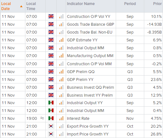 英国数据流将于07:00启动,预计第三季度GDP初值将自环比5.5%下滑至2.5%左右。虽然这个数据很重要,的时效性已经相当滞后。因此,交易员将通过同时发布的建筑、工业和制造业产出等同期指标就其进行评估。但企业投资在GDP中所占比例是一个前瞻性数据,所以如果这部分和其他数据一道走高,则构筑一个不错的信号,甚至有望略微支撑英镑。不过鉴于脱欧问题继续给英国(可能还有英央行前景)蒙上阴影,因一系列数据走弱引发的市场走势或要更为显著。