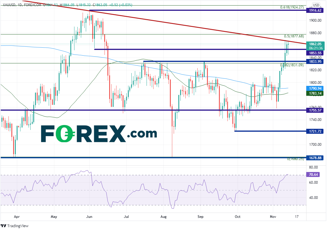 贵金属,尤其是黄金(现货黄金/美元)经常被视为通胀对冲产品。所以,当通胀上升时,基金通常涌入这些交易产品。11月4日以来,金价不断冲高,以连涨6天的势头进入上周五,攻克水平阻力关键价位,即2020年8月创下的历史高点到强支撑位1678.88低点行情的38.2%回档位上方的1831.09,也站上1853.55的水平阻力位。但过去三天金价一直受制于9月1日以来的下降趋势线(请看下图的红色线),而RSI也进入超买区域,报在70.64,表明价格可能回调。