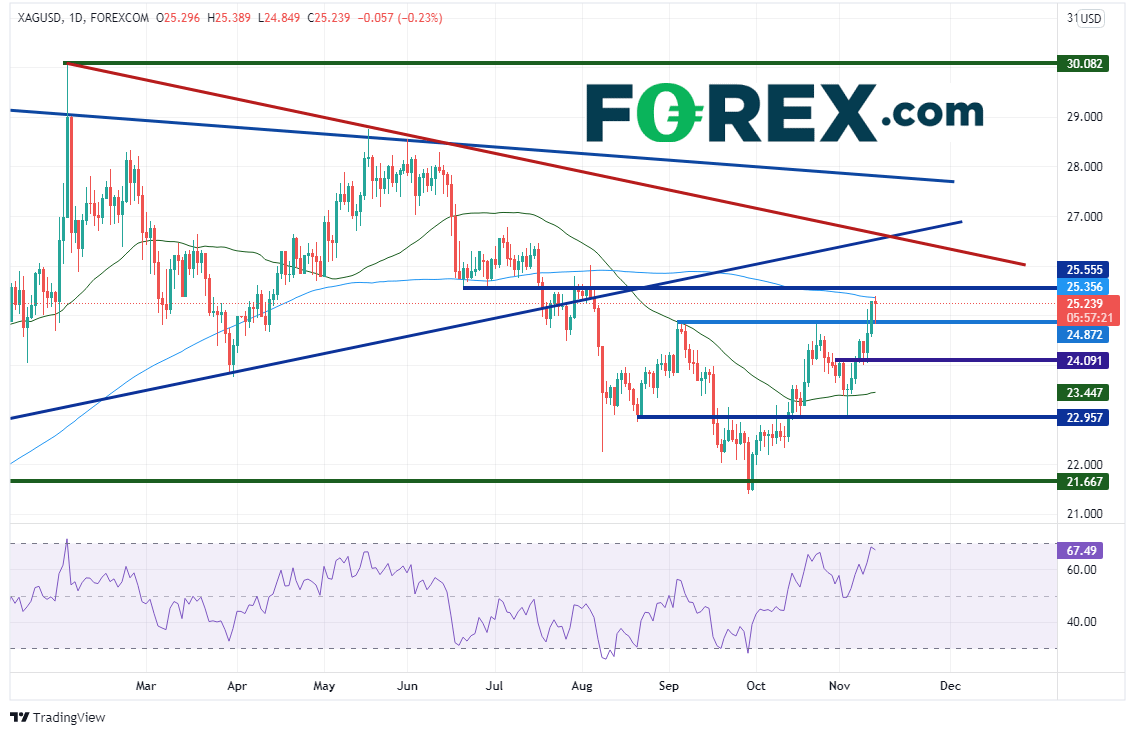 白银(现货白银/美元)自从在11月3日形成锤子形态以来也一直处于一个相似的形态内,持续走高之下攻克水平阻力位24.87,之后止步于200天均线25.35附近。上档不远处就是水平阻力位25.35,其上为多个阻力相汇的26.50附近,由2020年9月24日低点以来的长期上斜趋势线和2月21日高点以来的下降趋势线(红色线)构成。如果价格回撤,下档支撑位在前高点24.87、水平支撑位24.09和50天均线23.44。