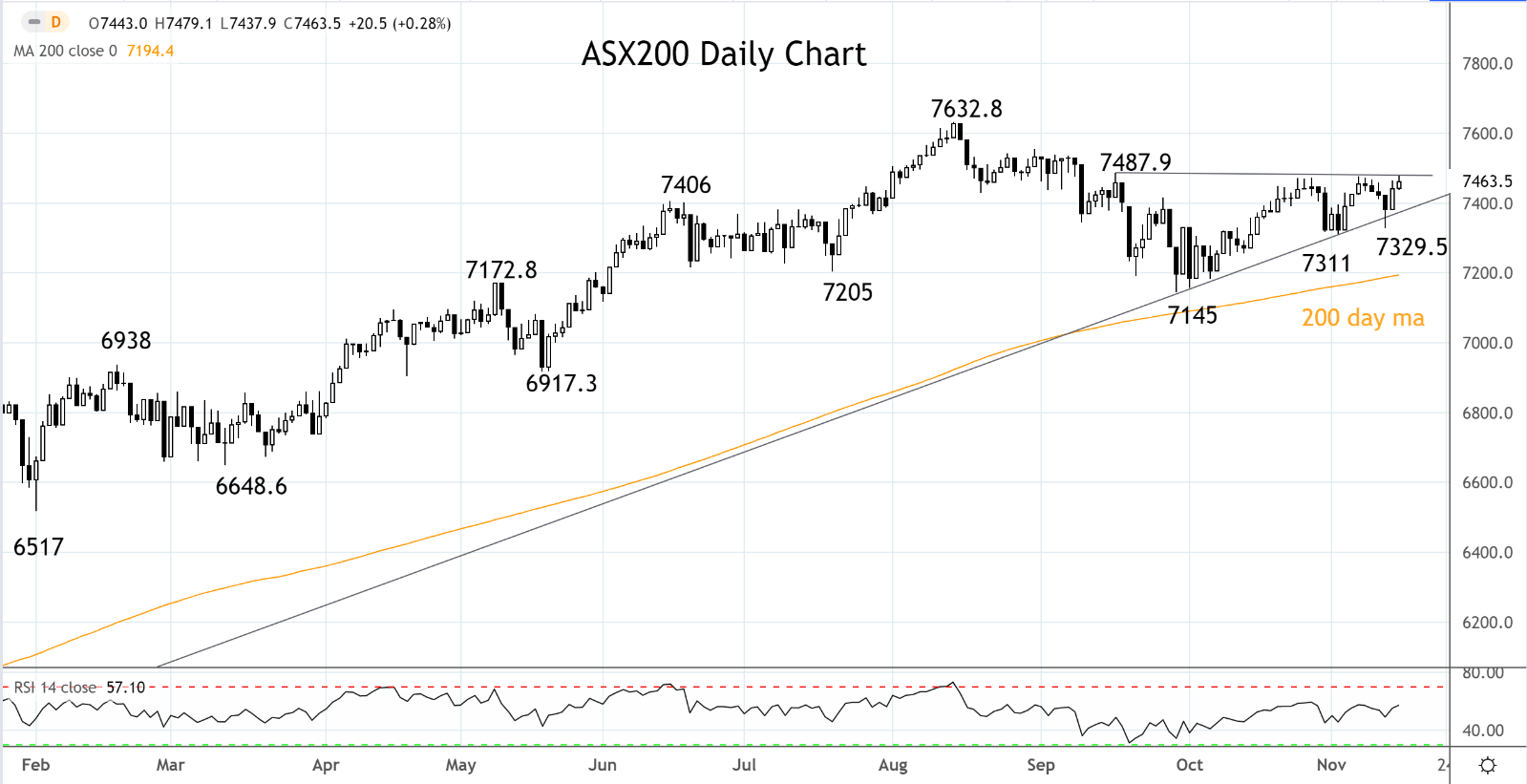 如果ASX200指数(现货指数)站上近期高点7477/87以来水平阻力带,则我们倾向于在7495做多,目标为反击8月高点7632,并且放置止损单。