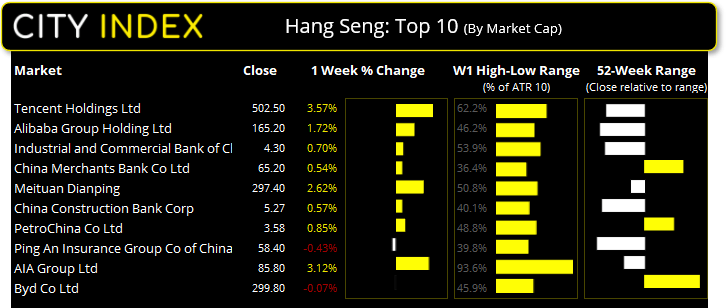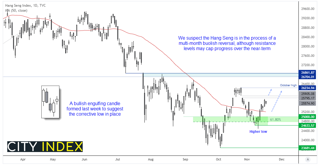 我们可以从日线图看到,恒生指数已反弹重回25000之上并构筑低点抬高,在61.8%回档附近形成看涨锤子线。50天均线也作为支撑守住。缺口阻力落在29500附近,此处可能充当阿里巴巴财报发布前的阻力水平。