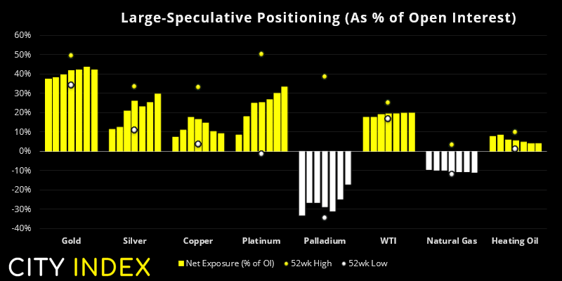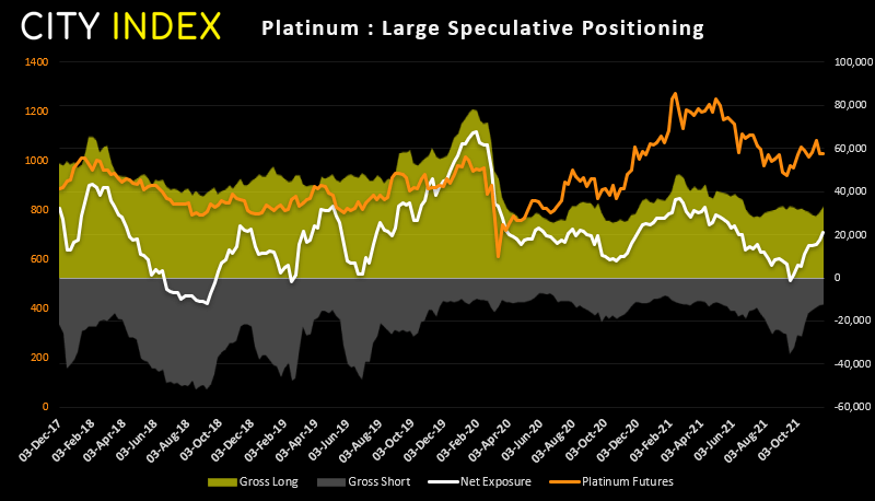 交易员自9月中旬以来一直在缩减空头合约,但值得注意的是多头合约已连续两周攀升。因此,开始时的空头回补现已转为健康的看涨趋势。不过,铂金价格上周收低,所以看来目前正处于修正阶段,但只要守在9月低点之上,我们就会寻求新的看涨机会。