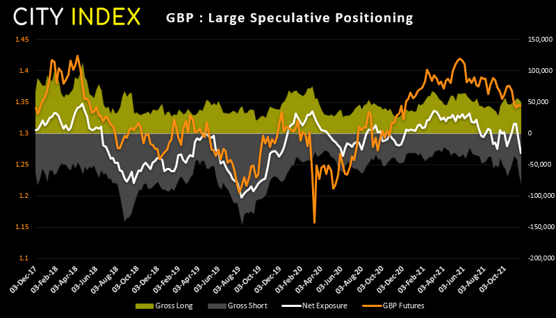- 大型投机者现正大举做空英镑期货,净空头敞口目前处于2020年6月以来最看跌水平。