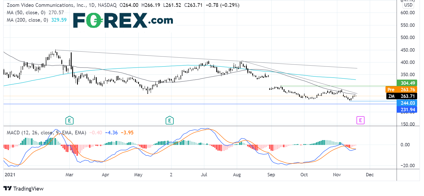 Zoom股价在2020年10月19日创下历史新高。此后,股价一路走低,构筑一系列高点和低点见底。股价11月8日探入245美元的14个月新低。但MACD指标看跌偏见减弱,加之潜在看涨交叉信号,买盘情绪依旧乐观。