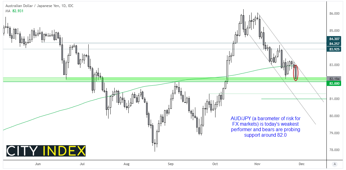 澳元/日元的后续走势当然值得关注。今天早前预期是82.0将作为支撑守住,该交叉盘跟随美元风险情绪冲高。但汇价现正试探该关键支撑区,若失守82.0则很可能触发一些大型止损并加速走低。还需要注意一点,汇价现已加速远离200天均线并交投于看跌通道内部。目前来看,今天高点下方保持看跌,货币对或下穿82.0。欧洲开盘期间交易员的反应可以帮助我们更好把握本周最后一天的市场走势。