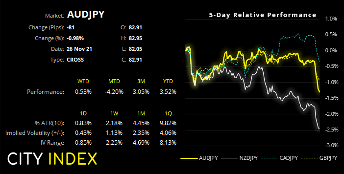 随着交易员纷纷买入日元避险,日元成为今天走势最佳的货币。澳元/日元和纽元/日元(外汇交易员风险指标)表现最弱,日波幅区间已到达ATR(日均真实波幅)。