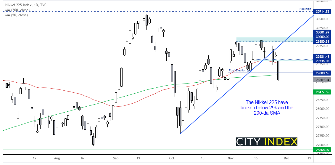 日经225指数同样加速推低。日线图开盘价在28336/81阻力区域并迅速跌破现位于29000的50和200天均线。由于市场已明显见顶并打破日线图趋势线,我们怀疑它或正在下看更低点。
