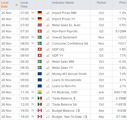 德国进口价格将于格林尼治时间07:00公布,数据已经录得连续12个月增长,因此今天也没有理由给出收缩预期。不过增速正在放缓,10月年率增长17.7%,仅较前值 16.5%上升了1.2个百分点。除此之外,今天无其他重要经济数据发布。美国市场将于午后收盘,为本周将画上一个安静的句号。