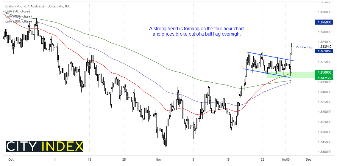 英镑/澳元上周创下9月以来涨幅最大的一周,之后随趋势稍事休息,汇价于10月高点下方整固。日线图现在构筑两次高点抬高和低点抬高,而隔夜动态带动英镑/澳元终于升穿10月高点。