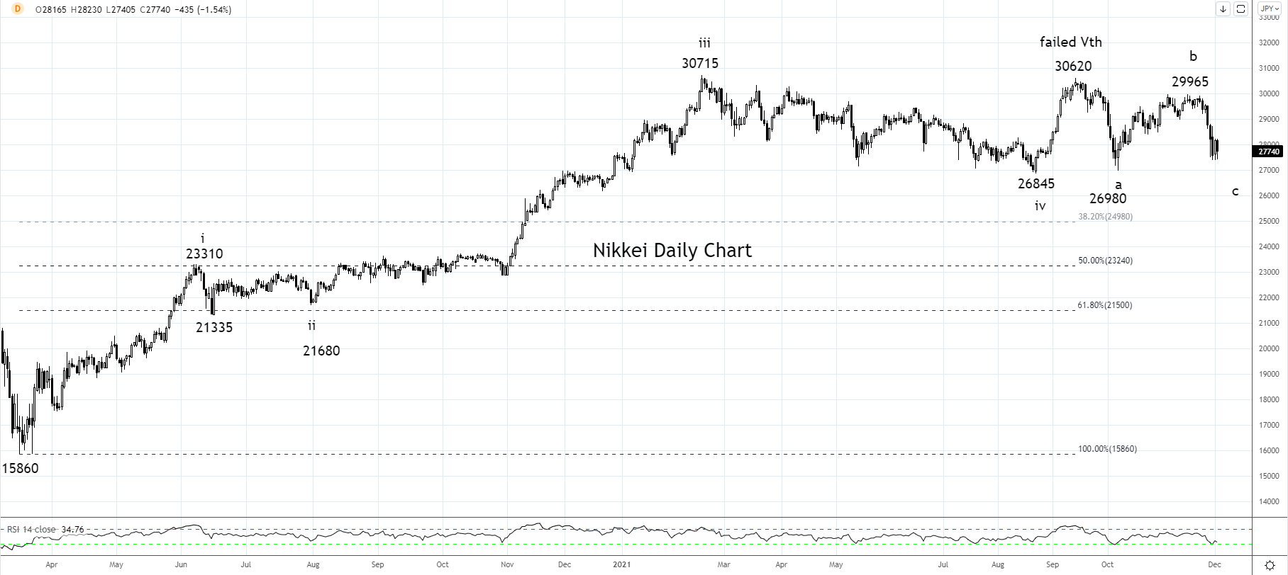 在完成从2020年3月疫情低点15680上涨至9月高点30620的五浪涨势后,日经225指数过去两周下修近8%,表现明显弱于对手股指,其中一部分原因是日元走强。