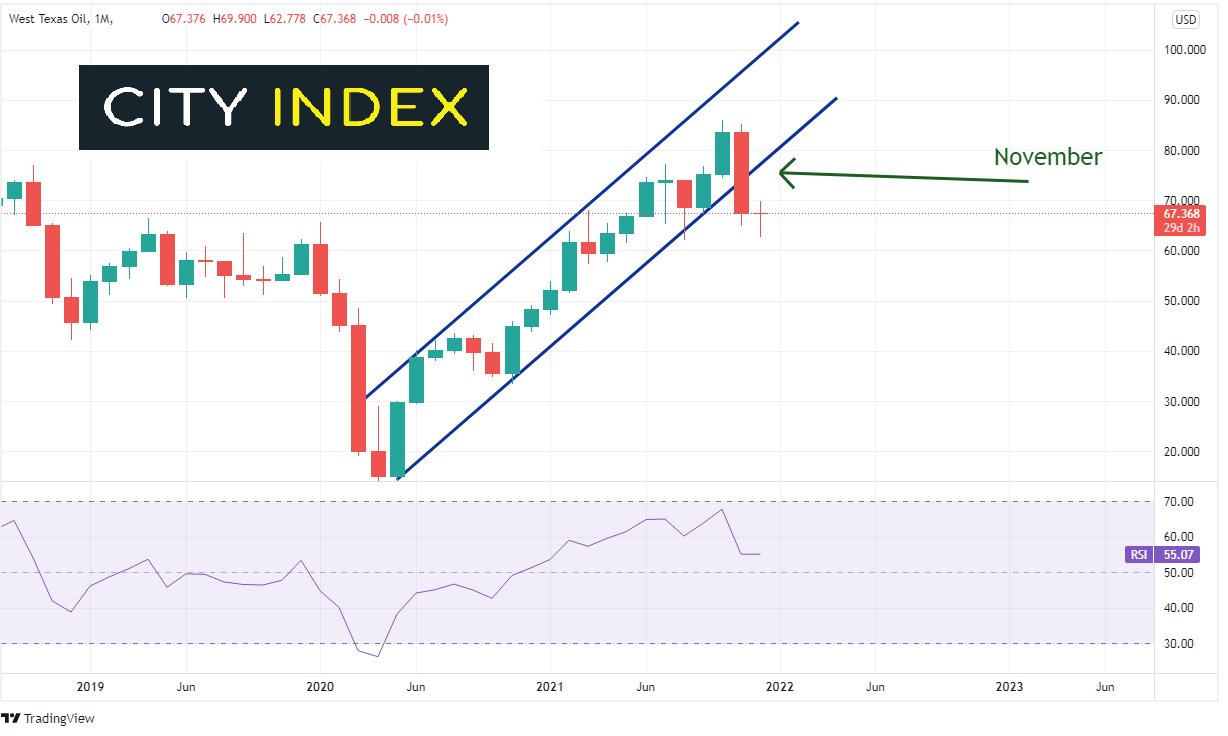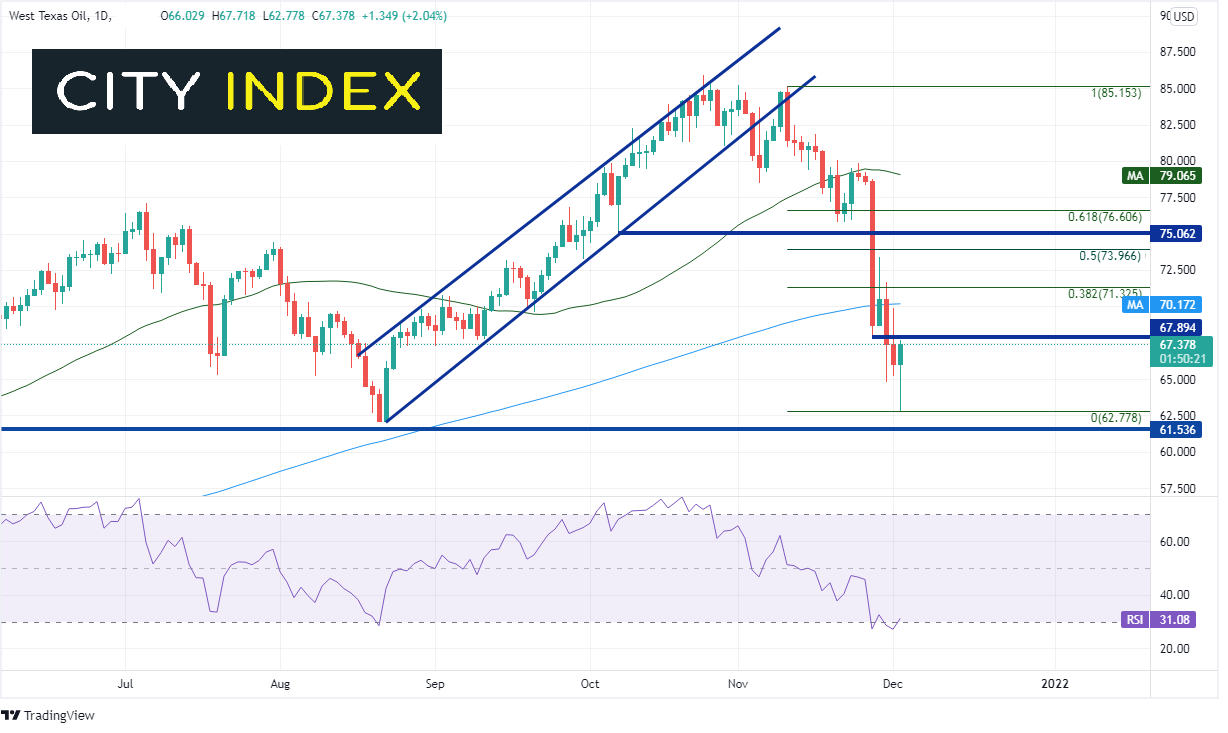 尽管OPEC+今天决定每天增产40万桶,WTI原油仍收盘上涨。声明中的“免责条款”为他们收回增产决定留了后路。此外,RSI处在超卖区域。但是,如果欧米克隆变种的情况较当前预期更糟,WTI可能很快重回周四低点!