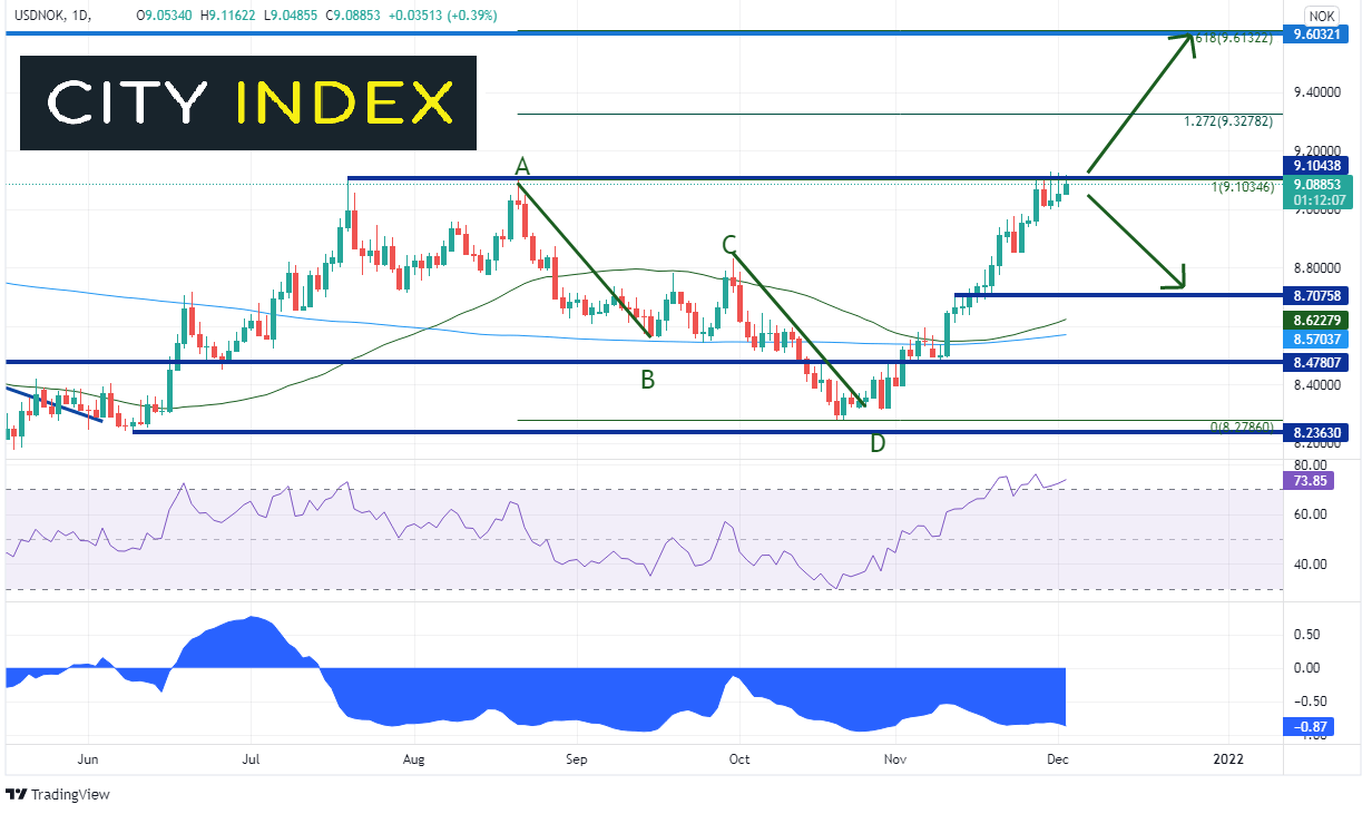 有意思的是,美元/挪威克朗并未随原油价格上涨回落。原油和美元/挪威克朗存在很强负相关。原油价格走低,美元/挪威克朗随之走高。这两种资产当前相关系数为-0.87。美元/挪威克朗是否洞悉了一些原油交易员所不知道的信息,即使是在RSI超买的情况下?周二高点为9.1292。若汇价上穿这一水平,则可能迅速攻向8月20日高点至10月21日低点下行之127.2%斐波那契扩展9.3278。161.8%扩展位和水平阻力位在9.60/9.61。如果美元/挪威克朗进入上述水平,则意味着WTI很可能下探。但若守住短线阻力,水平支撑在8.7076,然后是分别位于8.6228和8.5704的50天和200天均线。若汇价探入上述支撑,WTI很可能走高。