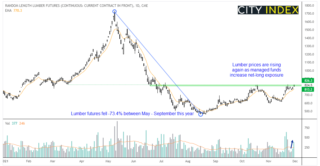 我们可以从期限不定的木材期货日线图上看到,价格已经上升,重新测试10月高点。过去三天,随着价格反弹,交易量有所增加,价格一直守在10天均线上方。之后,多头可能需要突破830美元以延续目前涨势,我们也希望管理型基金在潜在突破后能增加看涨敞口,以确认这点。但若价格跌破800美元,投机性多头可能会平仓,从而引发更深回调。但就目前而言,10月高点显然是交易员需重点监控的关键水平。