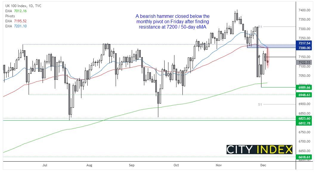 上周五,富时100指数当天收于月枢纽下方一条看跌pinbar,50天均线充当阻力位。若失守周五低点则可能已构筑临时顶部,后市或再度探向7000。有趣的是,期货市场指向开盘上行,但我们希望看到日收盘于7200之上才能巩固看涨信心。在此之前,我们更倾向于在周五区间小幅反弹后推低或等待价格下破低点。