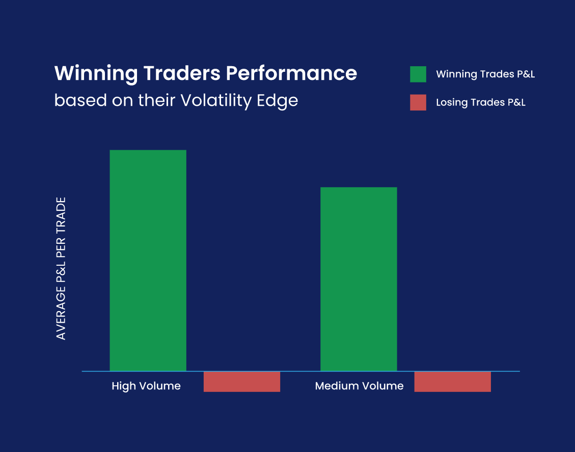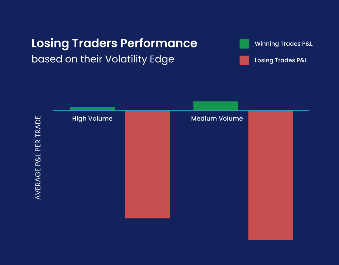 我们还发现有41%的交易者在市况震荡时的表现不同,其中有部分可以取得更好的成绩。这些人持有的盈利头寸更大而亏损头寸大体相埒,能够在波动性高的时候控制风险并利用较大的波动捕获更高的回报。