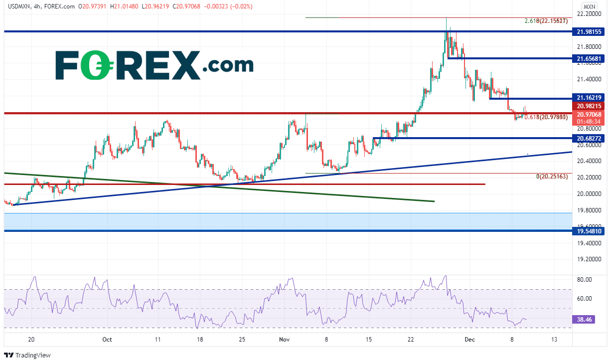 同样的4小时图上,美元/墨西哥比索回落且守住11月9日低点到11月26日高点行情的61.8%回档位,即20.97附近。上档的21.00也是心理大关和水平支撑/阻力所在,如果可以守住,后市可能上看水平阻力位21.1622、21.9816和近期高点22.1552,如果失守,请小心下跌至11月9日低点20.2516附近。但在跌至该位之前,首先必须击穿20.6872的水平支撑位与9月中旬以来的上升趋势线20.50。
