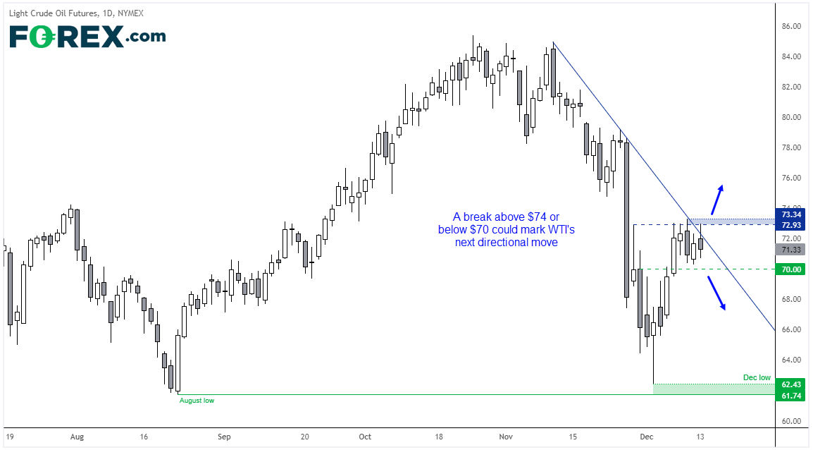 OPEC将2022年一季度原油需求预测值上调,声称Omicron变异病毒可能只短暂地产生温和的影响。这样的表态与世卫组织的态度截然相反,后者警告该新冠病毒的新变异病毒构成严重的全球性威胁。目前还不清楚油价是将再度跌至70下方还是站上趋势线,但我们略微倾向于上破,原因是其在上周以看涨锤子形态开启可靠站上8月低点的行情。如果站上73.34,则趋势线阻力失效,可以假设涨势延续。