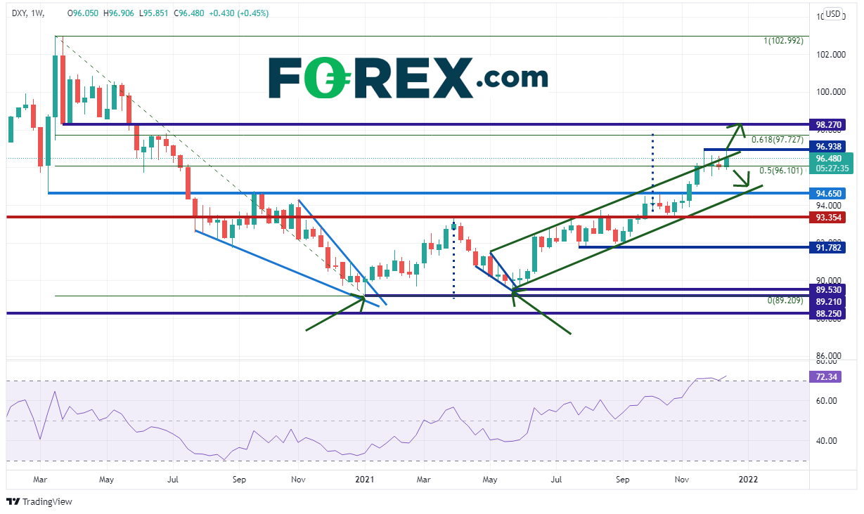 美元指数周图站上2021年5月以来所在通道的上轨趋势线,只是每周收盘都回到通道内。当价格未能突破通道的一端,接着往往测试另一端。该通道的下轨趋势线目标与水平支撑位交叉于94.65。周图RSI同样处于超买区域,暗示美元指数可能准备回撤。下档强水平支撑位在93.35。