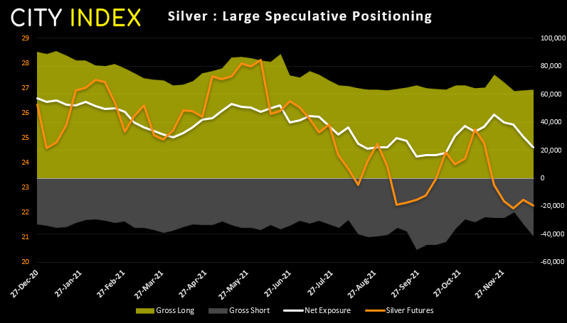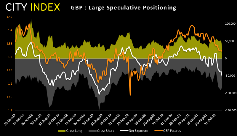 英镑整体走势仍很大程度上由空头主导,净空头敞口已降至22个月低点。随着奥密克戎变种病毒在英国肆虐,圣诞节前实施封锁几乎板上钉钉,英镑处境更为艰难。但同样的情况也适用于美国。因此,若英国新增病例和住院人数上某种程度先于美国减速,或构筑看涨信号。但我们也注意到,虽然净头寸仍然明显看空,但多空双方都已削减英镑敞口,这基本表明市场对英镑近期走势信心匮乏。