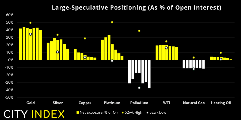 钯金期货仍是最不受宠的贵金属,也是唯一净做空的期货,并处于创纪录看跌水平。仓位清晰体现出空头数量猛增而多头减少。但鉴于创纪录水平的看跌,市场情绪走向极端的可能性也攀升。目前,我们尚未看到价格走势极端证据,因此,在动能显示反向信号前,我们继续看跌。