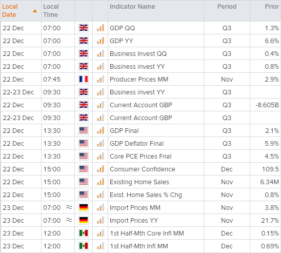 英国和美国第三季度GDP终值将分别于格林威治时间07:00和13:30发布。将于数据滞后性,除非较前值大幅修正,否则市场很可能不为所动。除此之外,我们或不得不依赖交易员对圣诞上行的热情来确定昨天反弹能否持续。
